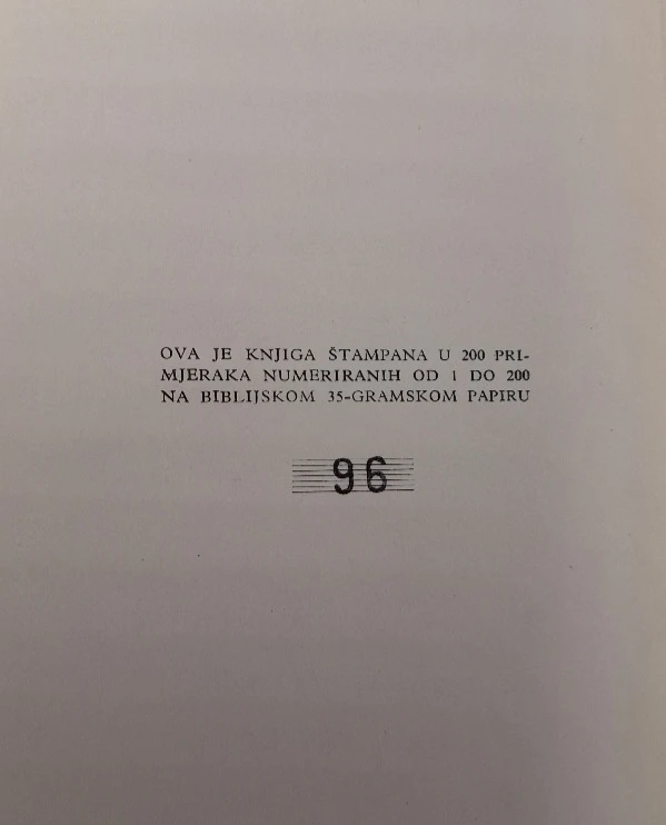 Ova je knjiga tiskana u 200 primjeraka numeriranih od 1 do 200 na biblijskom 35-gramskom papiru. Primjerak br. 96