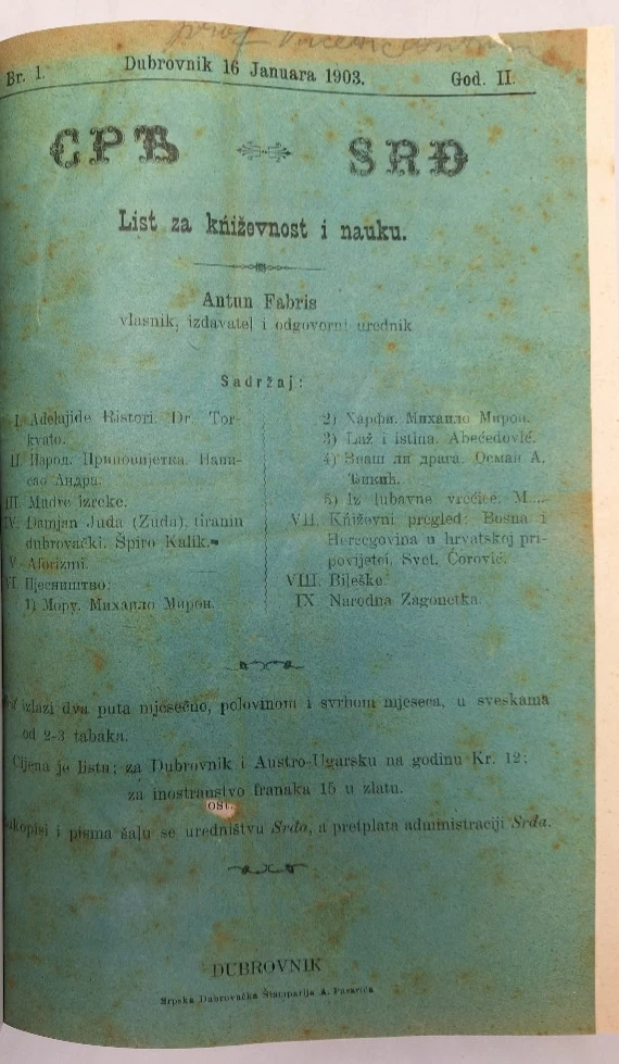 Početkom 1902. godine došlo je do osnivanja Srđa i Srpskodubrovačke biblioteke. List je izdavala Srpska Dubrovačka Štamparija Antuna Pasarića, a dodatak uz ime mu je bio list za kniževnost i nauku. Pokretanje časopisa bilo je najavljeno proglasom na naslovnici zadnjeg broja lista Dubrovnik za 1901. godinu, u broju 56 od 29. prosinca. Proglas su potpisali profesor Luko Zore kao glavni suradnik i Antun Fabris kao vlasnik i urednik.